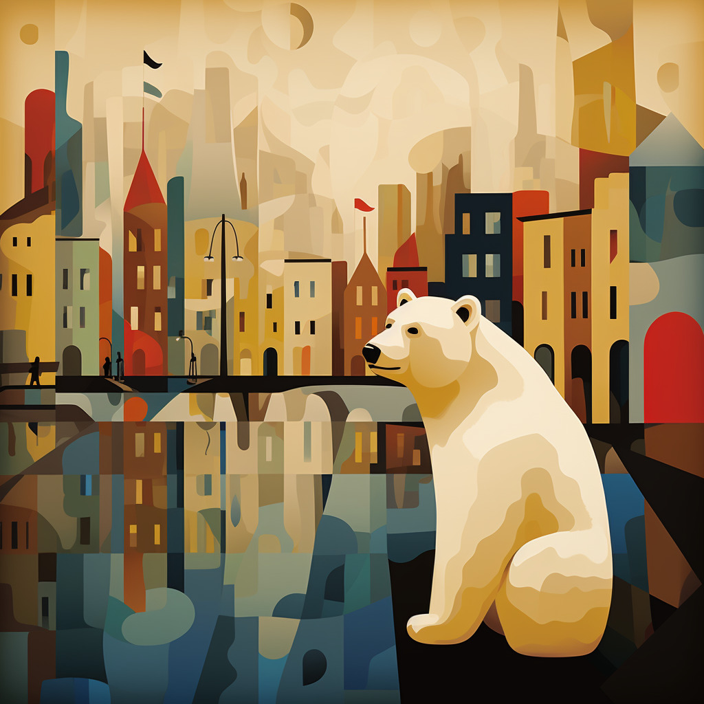 북극곰 일러스트: De Stijl illustration, Polar bear, DreamWorks art style, Mermaid Lagoon color palette, Beige background, City during the rain background, Mystical mood, --q 1 --ar 1:1