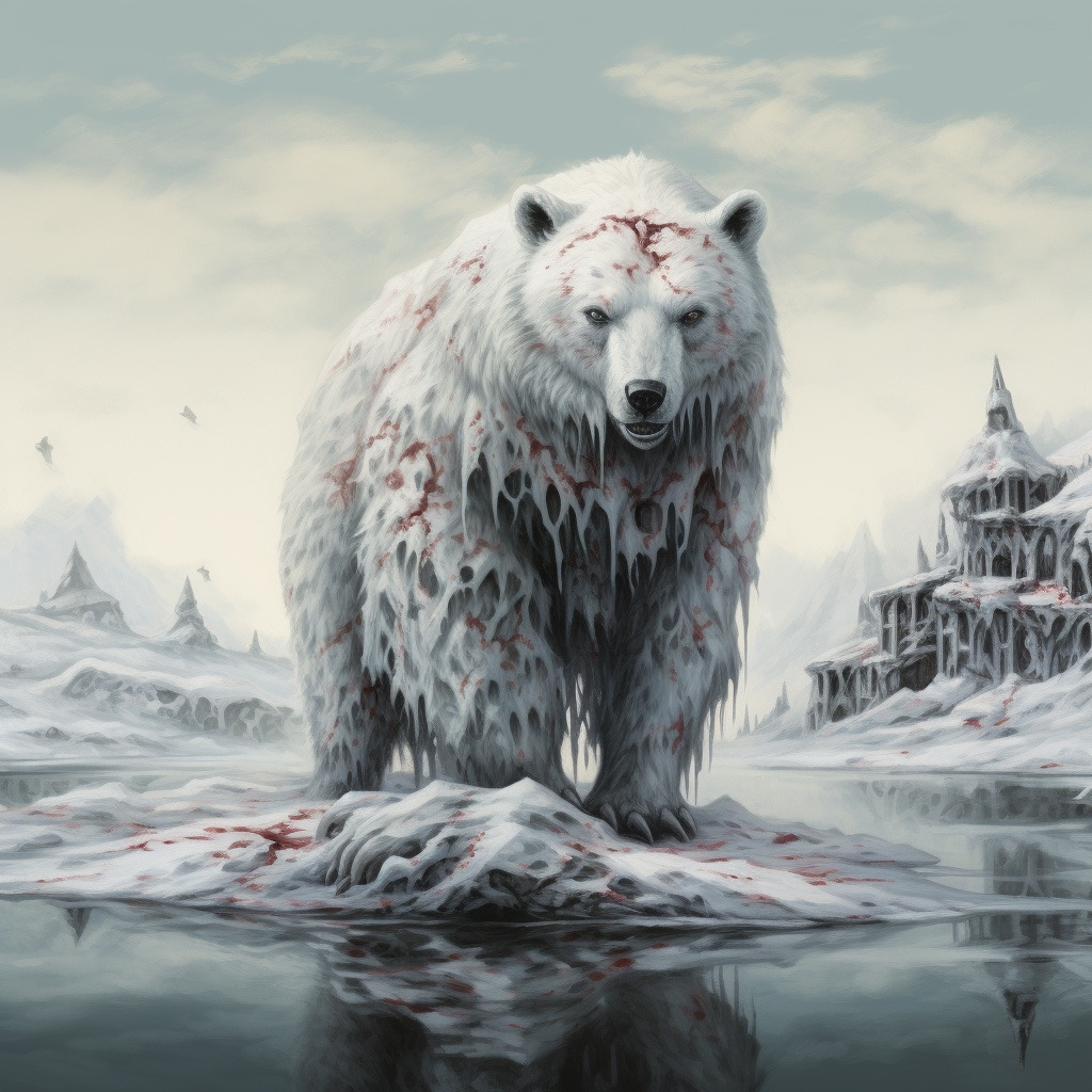 북극곰 일러스트: Horror Illustration, Polar bear, Julia Sarda art style, Porcelain White color palette, Silver background, Fantasy landscape background, Hypothetical mood, --q 1 --ar 1:1