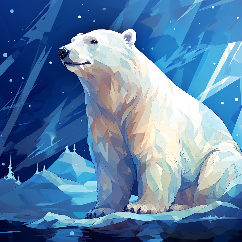 북극곰 일러스트: Technical Illustration, Polar bear, Julia Sarda art style, Crystal Clear color palette, Cobalt Blue background, Northern lights sky background, Iconoclastic mood, --q 1 --ar 1:1