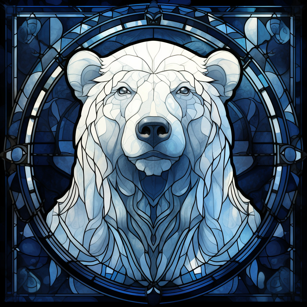 북극곰 일러스트: Monochrome illustration, Polar bear, Beatrice Blue art style, Gothic Dark color palette, Indigo background, Stained glass background, Inspirational mood, --q 1 --ar 1:1