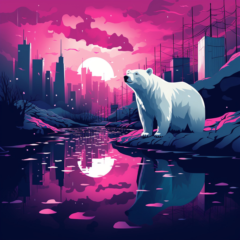 북극곰 일러스트: Editorial Illustration, Polar bear, Christian Robinson art style, Urban Night color palette, Magenta background, Murky swamp at dusk background, Cozy mood, --q 1 --ar 1:1