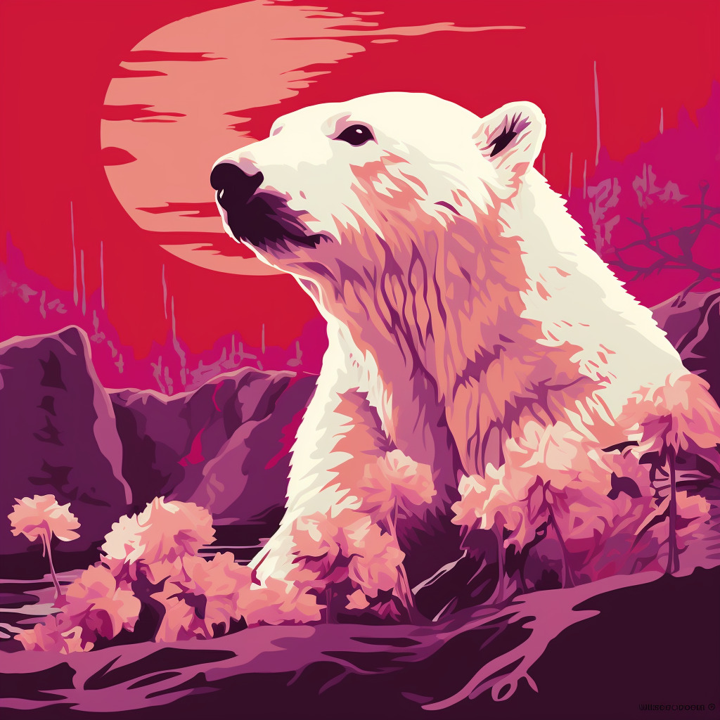 북극곰 일러스트: Pop Art Illustration, Polar bear, Beatrix Potter art style, Wild Berry color palette, Magenta background, Japanese garden background, Feverish mood, --q 1 --ar 1:1
