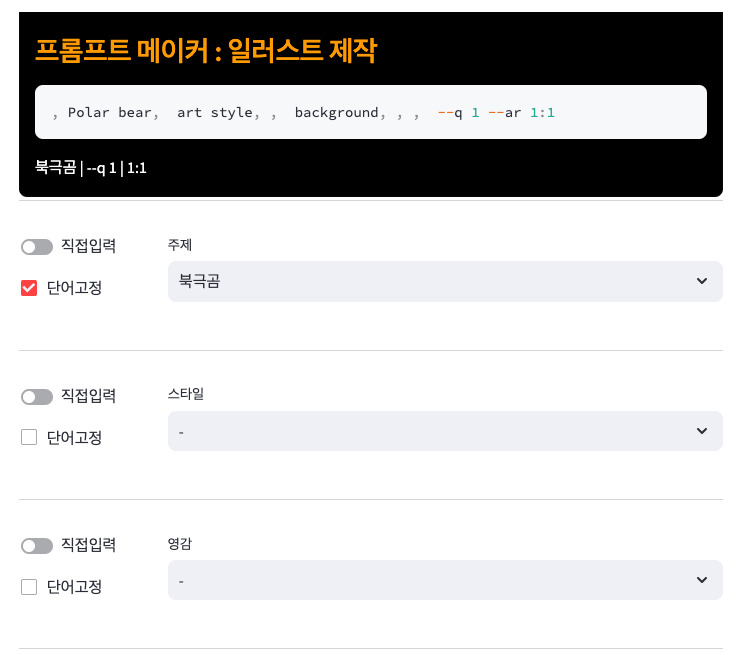 제가 개발한 프롬프트 메이커는 이런 번거로운 프롬프트 작성을 쉽게 해서 AI 디자인의 생산성을 높일 수 있습니다.
