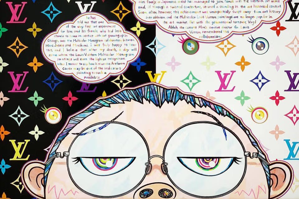 구찌와 미키마우스, 로에베와 센과 치히로, 발렌시아가와 심슨 등 명품 브랜드와 캐릭터의 콜라보가 흔하게 보인다. 이 열풍의 시발점엔 무라카미 다카시와 루이비통이 있다. 무라카미 다카시 본연의 비비드한 색상과 개성 있는 캐릭터로 루이비통을 회춘시켜버리고 콜라보는 그야말로 대박을 터뜨린다.