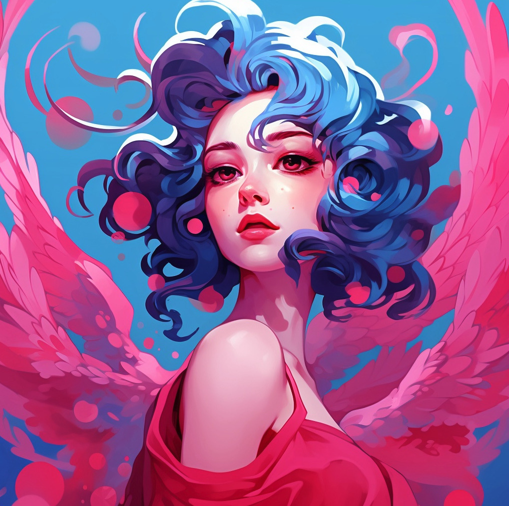 애니메이션 캐릭터: 천사의 전통 만화 캐릭터 그림, 32K UHD, 기발한 애니메이션, 빨간색, 파란색 및 은색, 마젠타 배경 --ar 1:1 --v 5.2