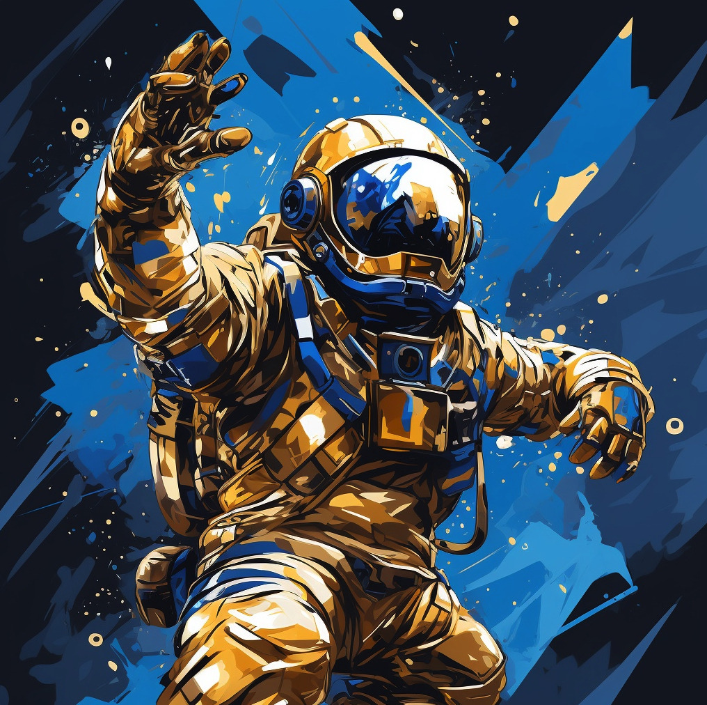 Paint Character illustration of astronaut, Gesture, Whimsical anime, Gold, Black, and Royal Blue, Cyan background --ar 1:1 --v 5.2