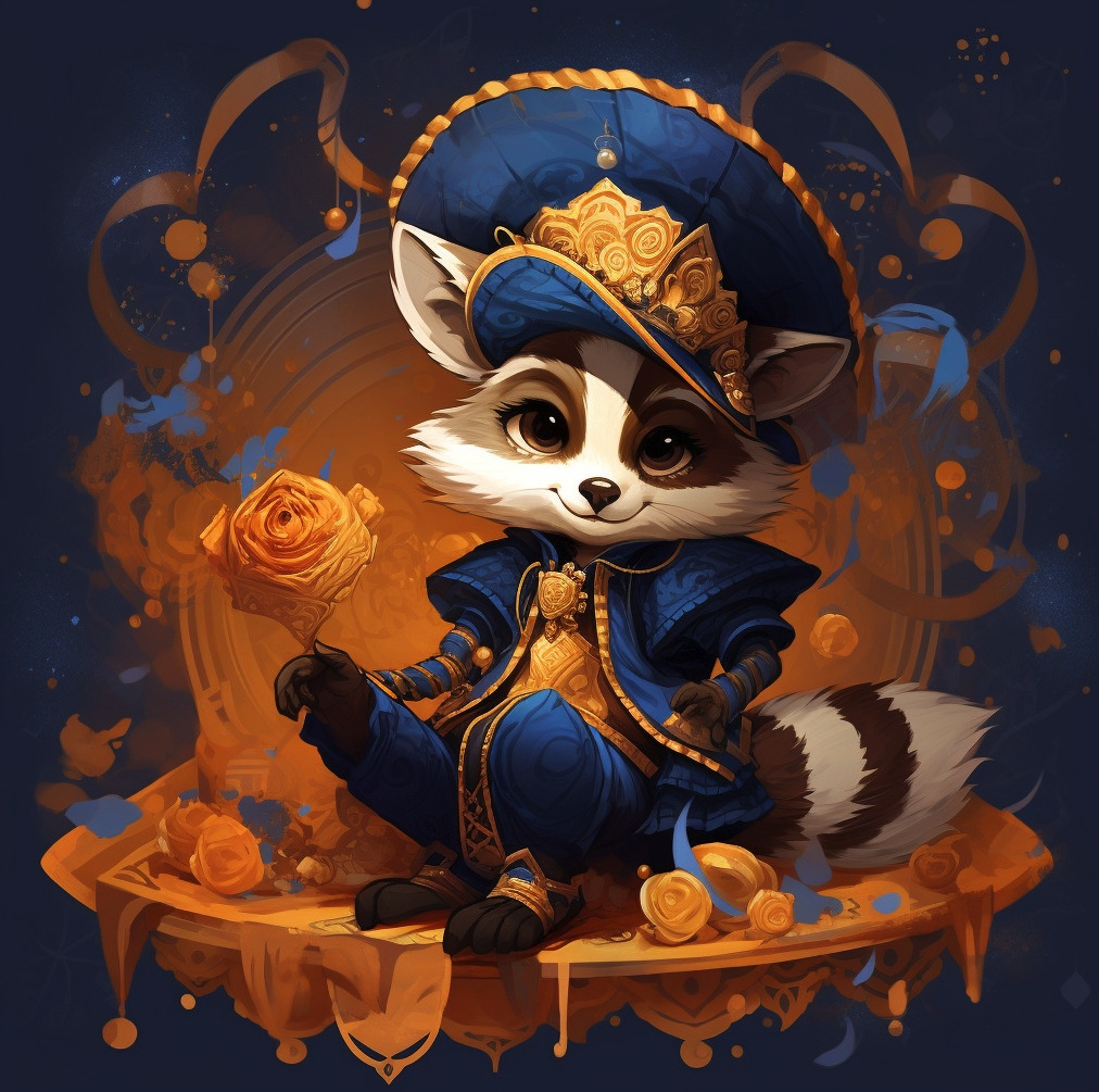 raccoon, Playful character design, Whimsical anime, Gold, Black, and Royal Blue, Sienna background --ar 1:1 --v 5.2