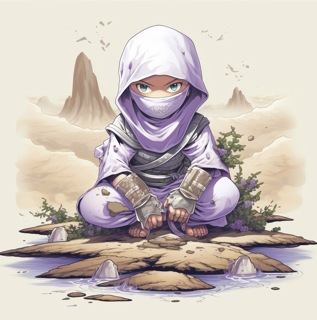 Manga Character illustration of Ninja, Hatching, Whimsical anime, Lavender, White, and Silver, Tan background --ar 1:1 --v 5.2