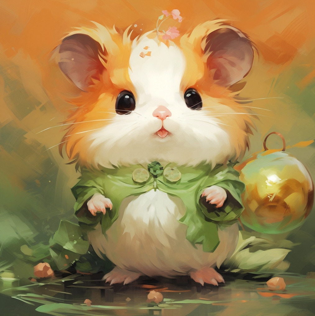 hamster, Loose brushwork, Whimsical anime, Emerald, Gold, and White, Peach background --ar 1:1 --v 5.2