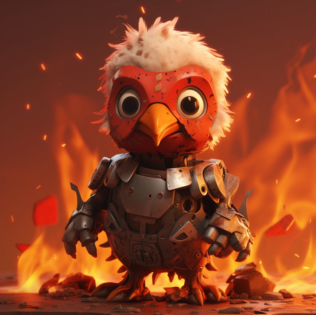 애니메이션 캐릭터: 병아리의 3D 캐릭터 일러스트, 애니메이션 GIF, 기발한 애니메이션, 목탄, 빨간색 및 은색, 번트 오렌지 배경 --ar 1:1 --v 5.2