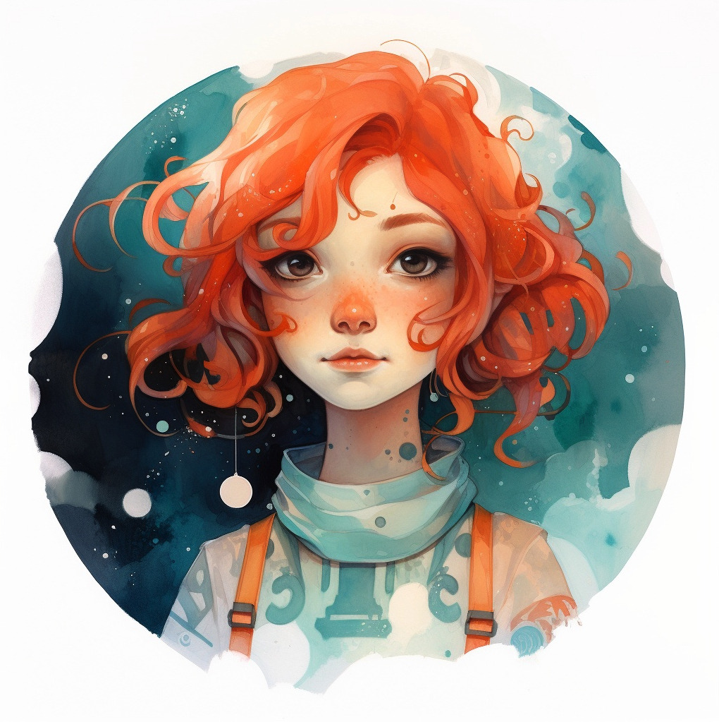 Watercolor Character illustration of female, Cartoonish character design, Whimsical anime, Dark orange and white, Teal background --ar 1:1 --v 5.2