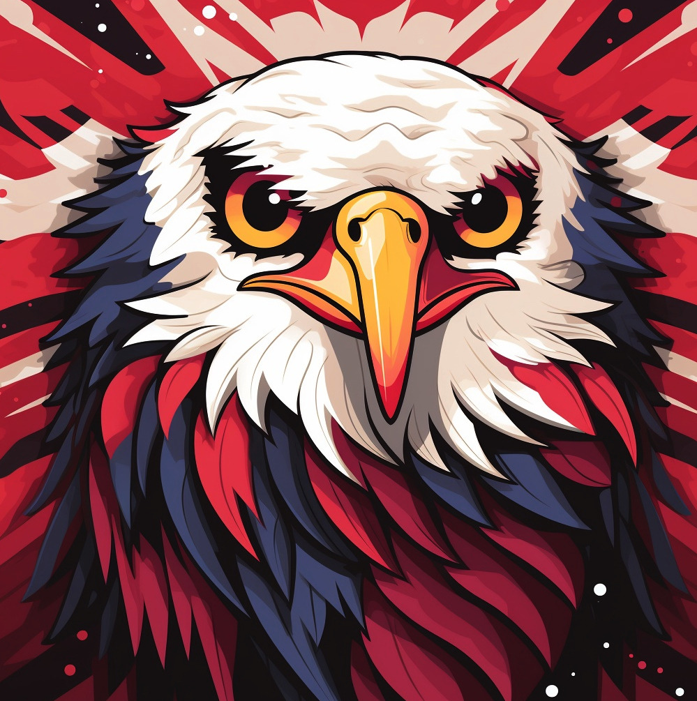 Pattern Character illustration of eagle, Strong facial expression, Whimsical anime, Red, White, and Black, Magenta background --ar 1:1 --v 5.2