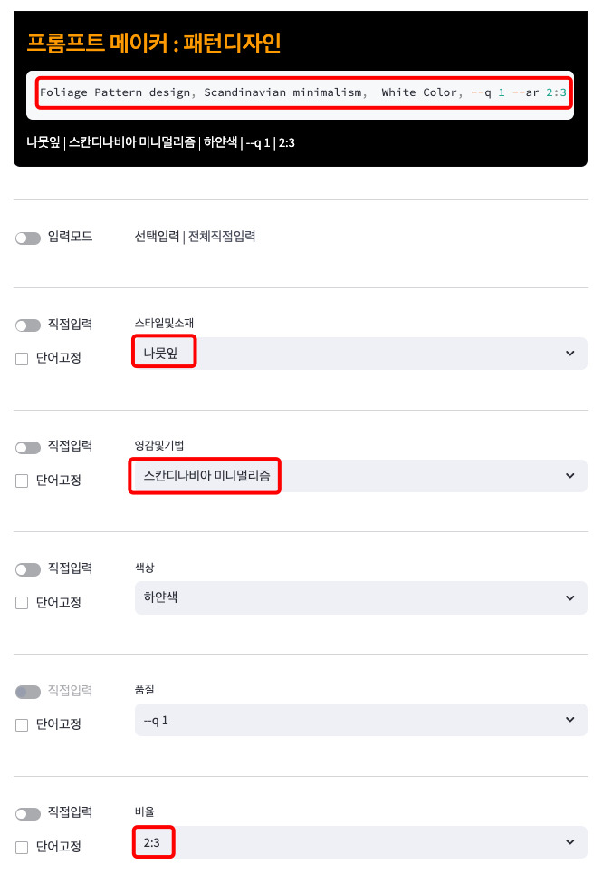 스칸디나비아 미니멀리즘 스타일의 하얀색 수건 디자인을 만들어보기로 합니다. 아래와 같이 패턴 디자인 프롬프트 메이커에서 적절한 한글 메뉴를 선택합니다.
