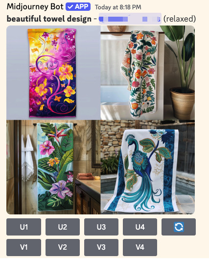 상단에 만들어진 영문 프롬프트를 복사해서 그대로 미드저니에 넣어주면 아래와 같은 수건 디자인이 만들어집니다.