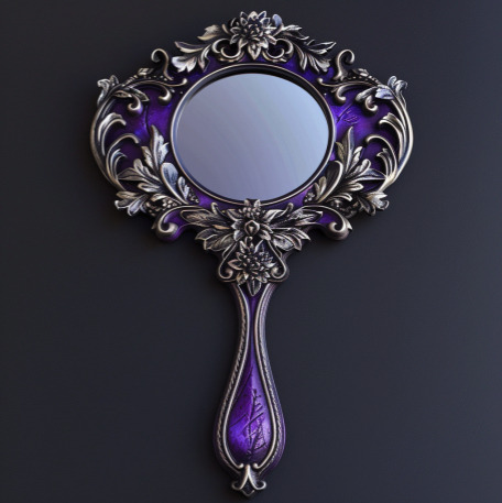 손거울 디자인 8: Design hand mirror in a Jacobean style inspired by the art of Rockwell Group, Purple and silver color scheme --ar 1:1