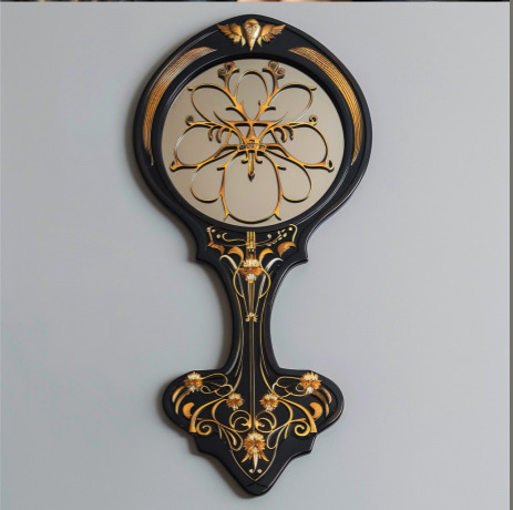 손거울 디자인 10: Design hand mirror in a Futuristic style inspired by the art of Alphonse Mucha, Black and gold color scheme --ar 1:1