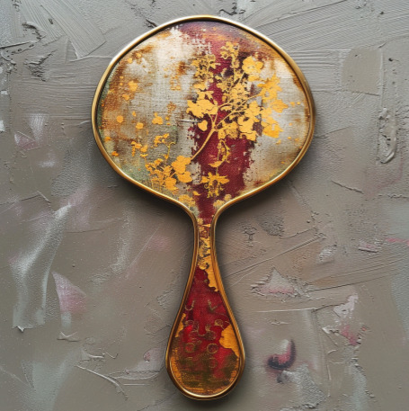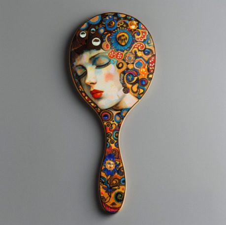 손거울 디자인 1: Design hand mirror in a Roman style inspired by the art of Gustav Klimt, Split-complementary colors color scheme --ar 1:1