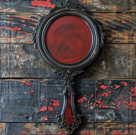 손거울 디자인 6: Design hand mirror in a Farmhouse style inspired by the art of Jan van Eyck, Red and black color scheme --ar 1:1