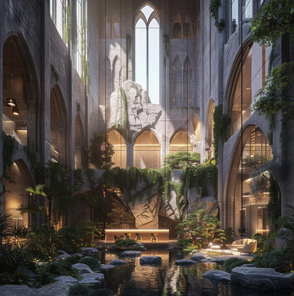 호텔 건축 디자인 8: A Hotel of a Direct View in a Neogothic style, with Bio-based materials. Rendered in Unreal Engine by Renzo Piano
