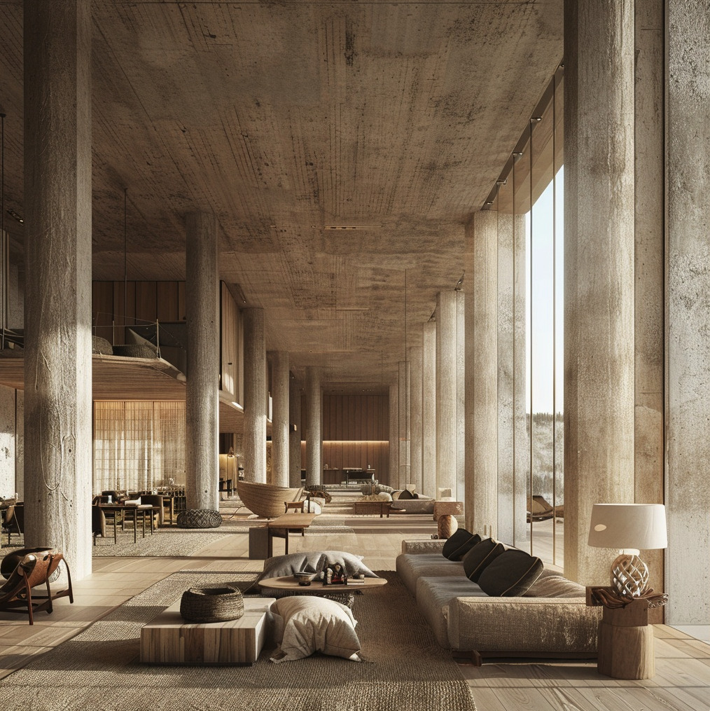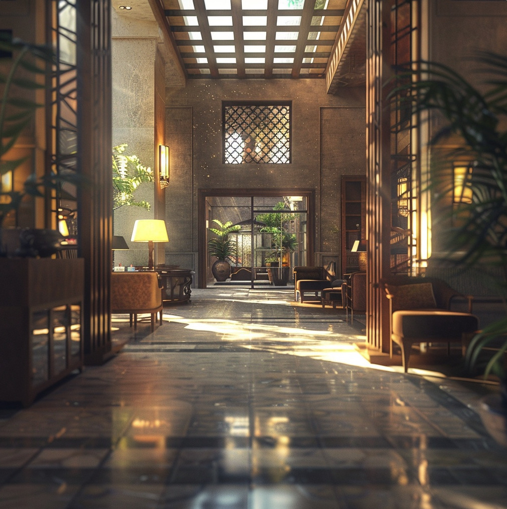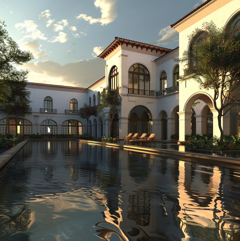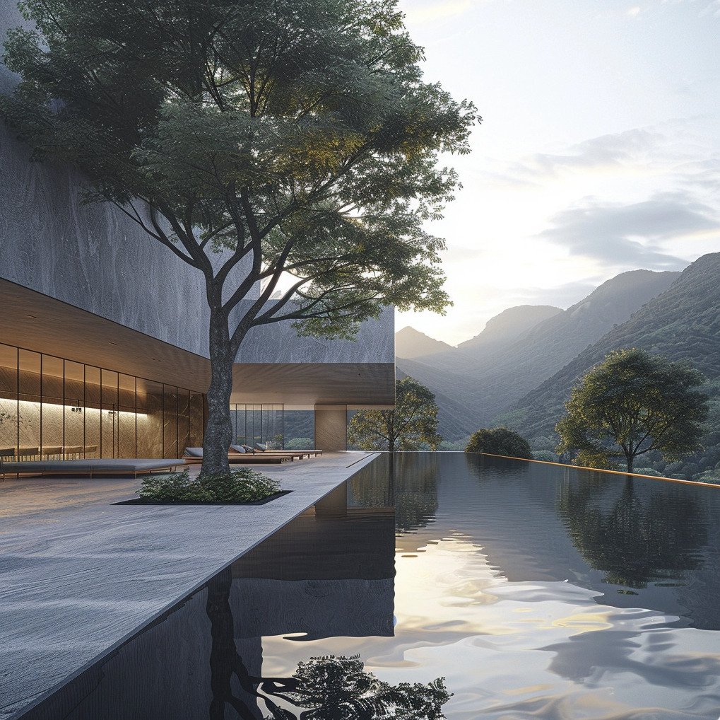 호텔 건축 디자인 10: A Hotel of a Long Shot View in a Classical style, with Sustainable design. Rendered in Clarisse iFX by Tadao Ando