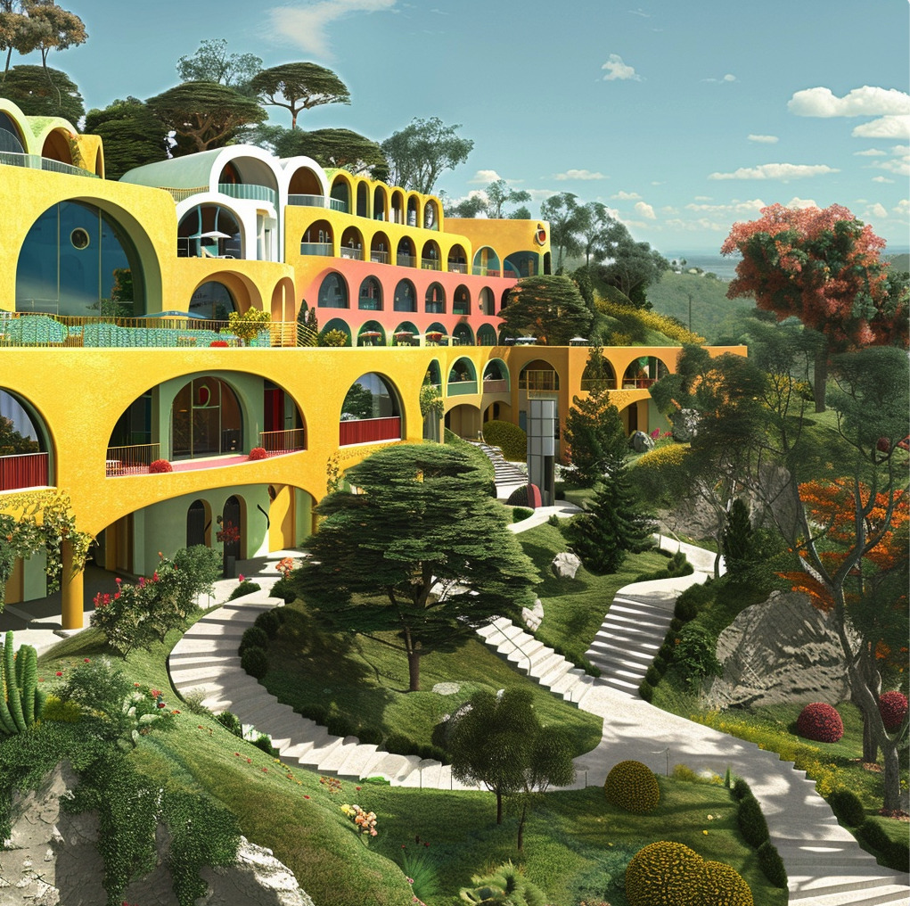호텔 건축 디자인 1: A Hotel of a Wide Shot View in a Storybook Style style, with Terraced design. Rendered in by Richard Rogers