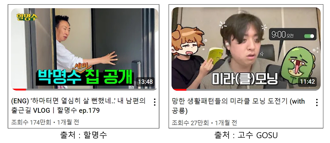 하지만 정반대의 콘텐츠도 있습니다. 박명수님의 '하마터면 열심히 살 뻔했네', 고수님이 덕개님, 수현님과 함께 한 '미라클 모닝 도전기'가 있죠.