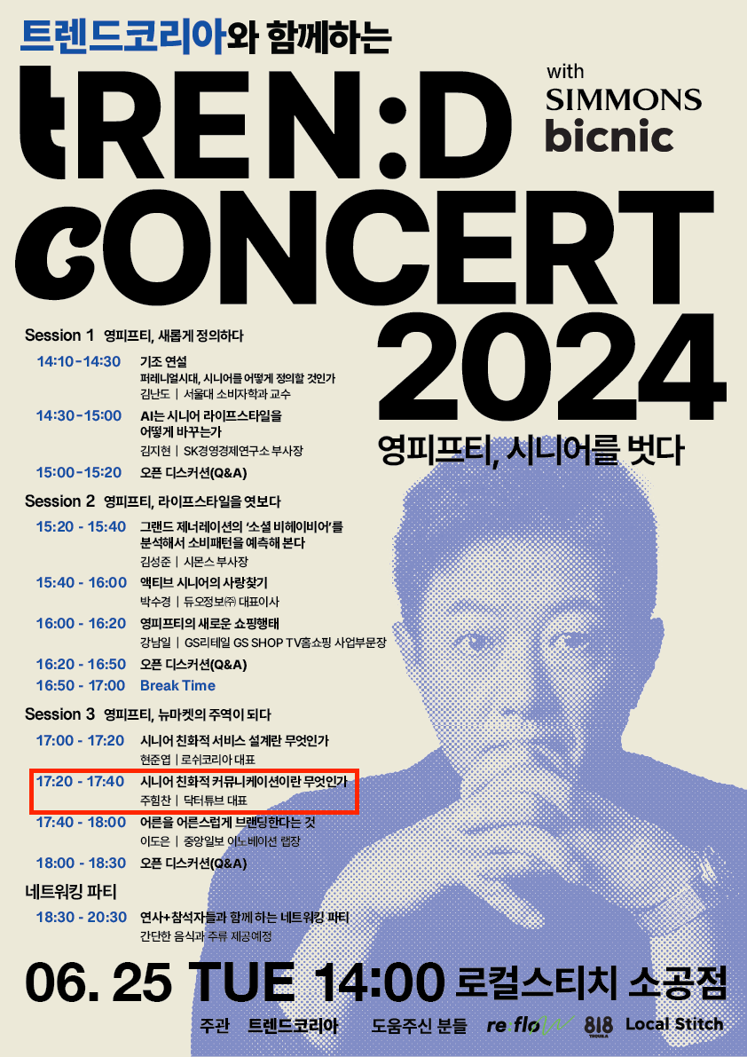 <트렌드 코리아>에서 매년 개최하는 <트렌드 콘서트 2024>입니다. 2023년 트렌드 코리아의 주제는 '로컬'이었고, 2024년 주제는 '영피프티, 시니어를 벗다'입니다.