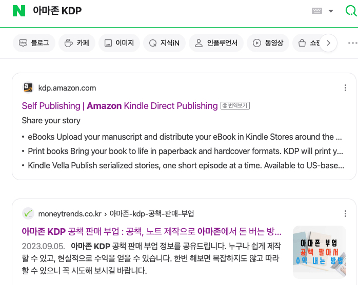 아마존 KDP 출판은 우리나라에서는 진지하게 책을 쓰는 작가들의 출판 채널이라기보다는 쉽게 돈을 버는 패시브 인컴으로 더 많이 알려져 있습니다. 네이버에 '아마존 KDP'를 검색해도 아마존 공책이 검색 순위 1위로 뜨는 것이 현실입니다.