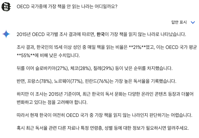 OECD 국가 중 가장 책을 안 읽는 나라는 어디일까요? 답은 이미 알고 계시겠지만, 한국입니다. 아래는 구글의 AI 제미나이가 준 답입니다.
