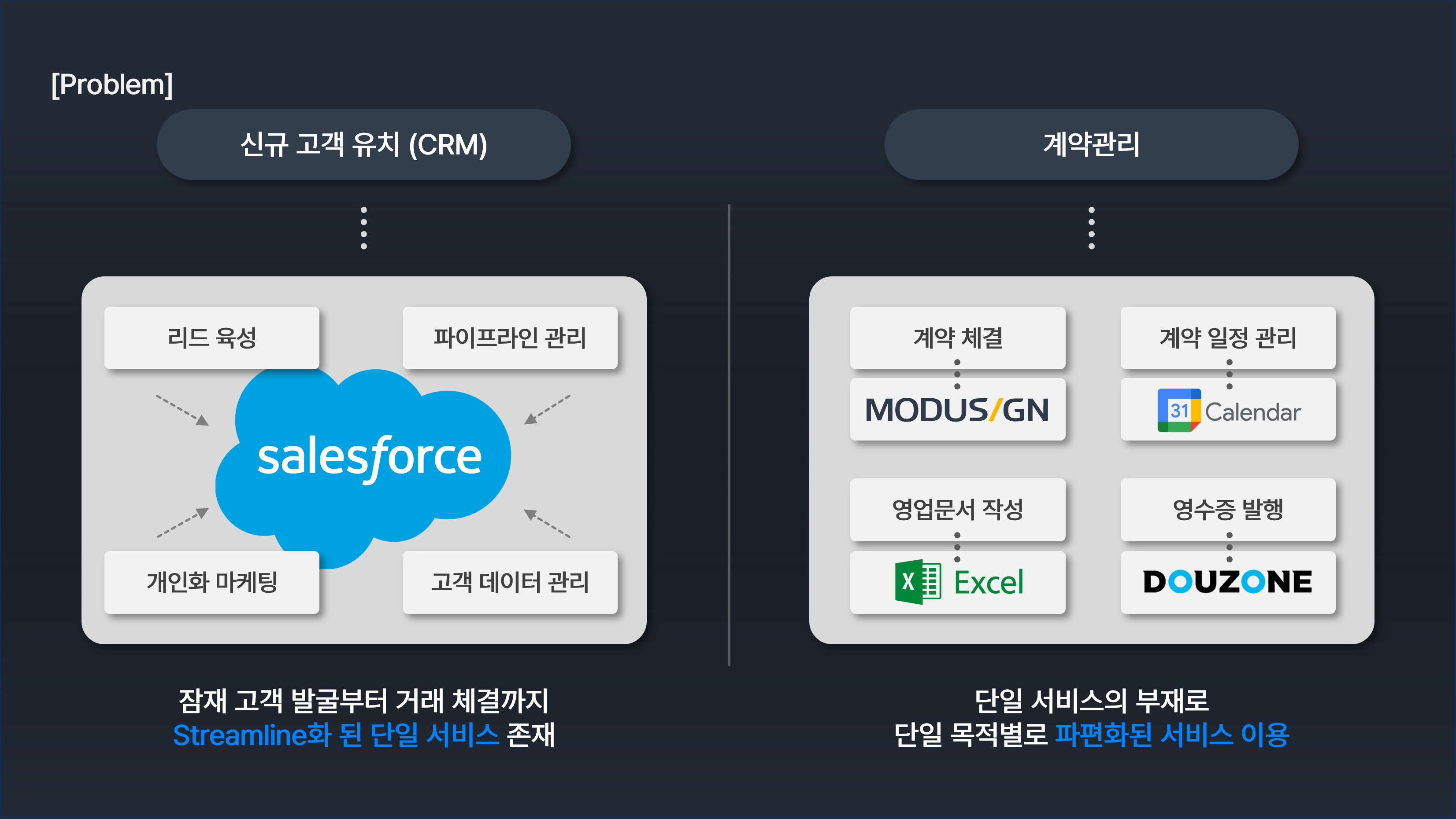 각 서비스들끼리 서로 계정과 데이터가 호환이 되지 않는다는 점도 큰 비효율을 유발합니다. 재무팀에서 세금계산서를 한 번 발급하려고 해도, 계약서 파일을 열어서 금액 및 지급 조건을 확인하고, 세일즈팀에 금액 더블체크를 하고 매일 엑셀에 들어가서 오늘의 일정을 확인해야 하죠.