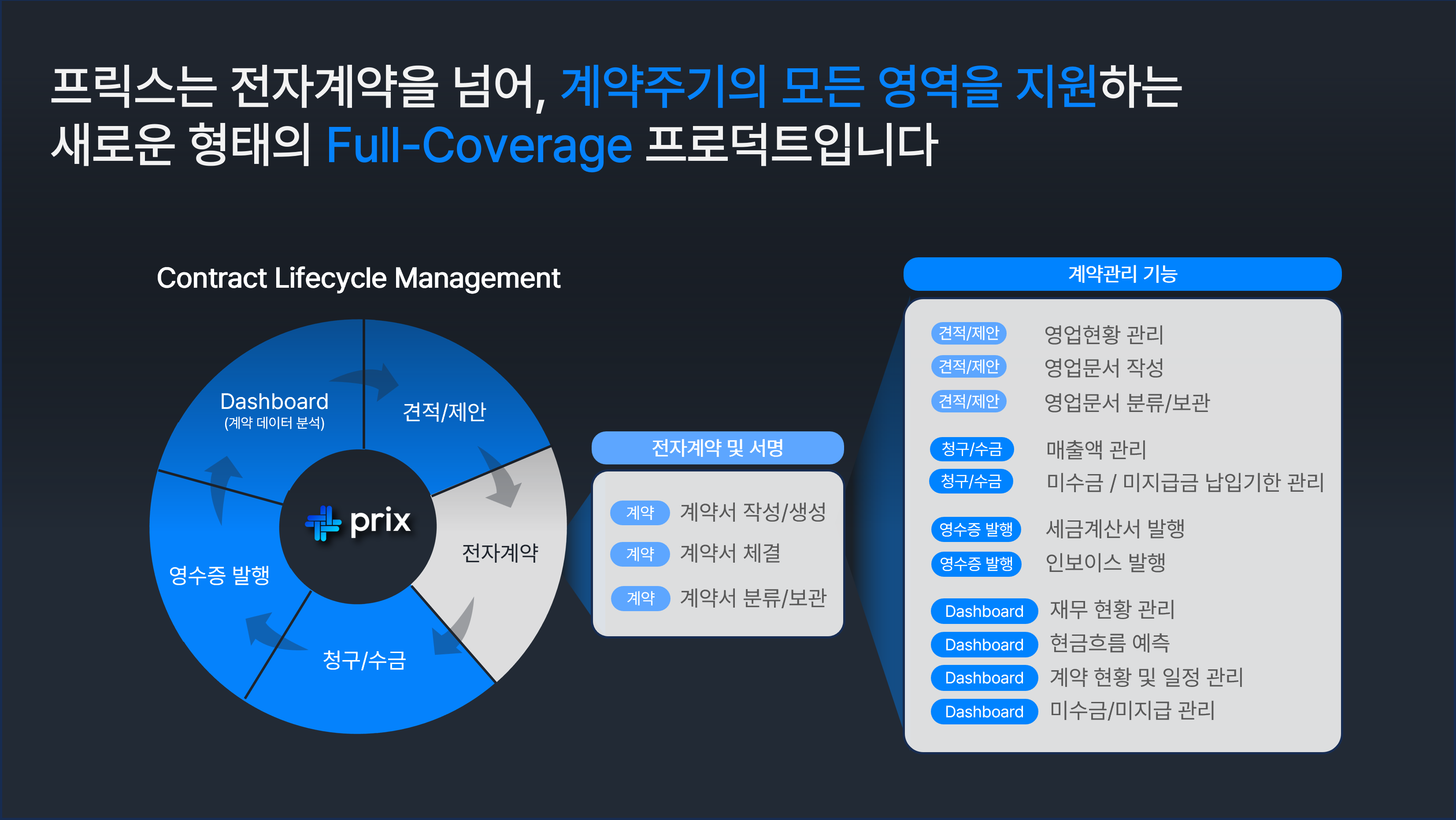 일반적으로 계약은 '견적 ➡️ 체결 ➡️ 이행 ➡️ 수금/지급 ➡️ 종료/갱신 + 종합(대시보드)'이라는 주기성을 갖습니다. 프릭스는 이 모든 과정을 지원합니다. 즉, 계약관리는 계약을 관리하는 행위 자체가 저희 제품 안에서 이루어지는 것을 의미합니다.
