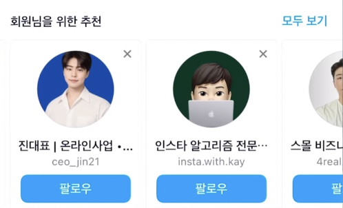 계정 설명 밑에 나오는 [회원님을 위한 추천] 계정들도 같은 카테고리일 거예요. 최대한 모두 팔로우합니다.