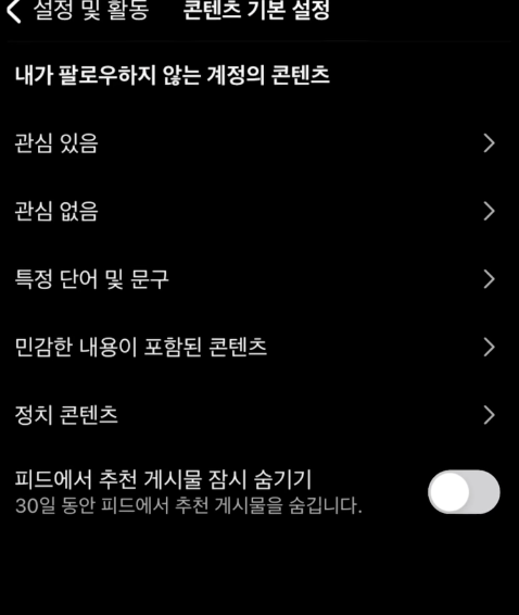 이번에는 설정에서 추천 콘텐츠를 누르고, [피드에서 추천 게시물 잠시 숨기기]를 비활성화해주세요