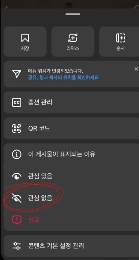 상관이 없는 사람들의 게시물은 [관심 없음]을 클릭하세요.