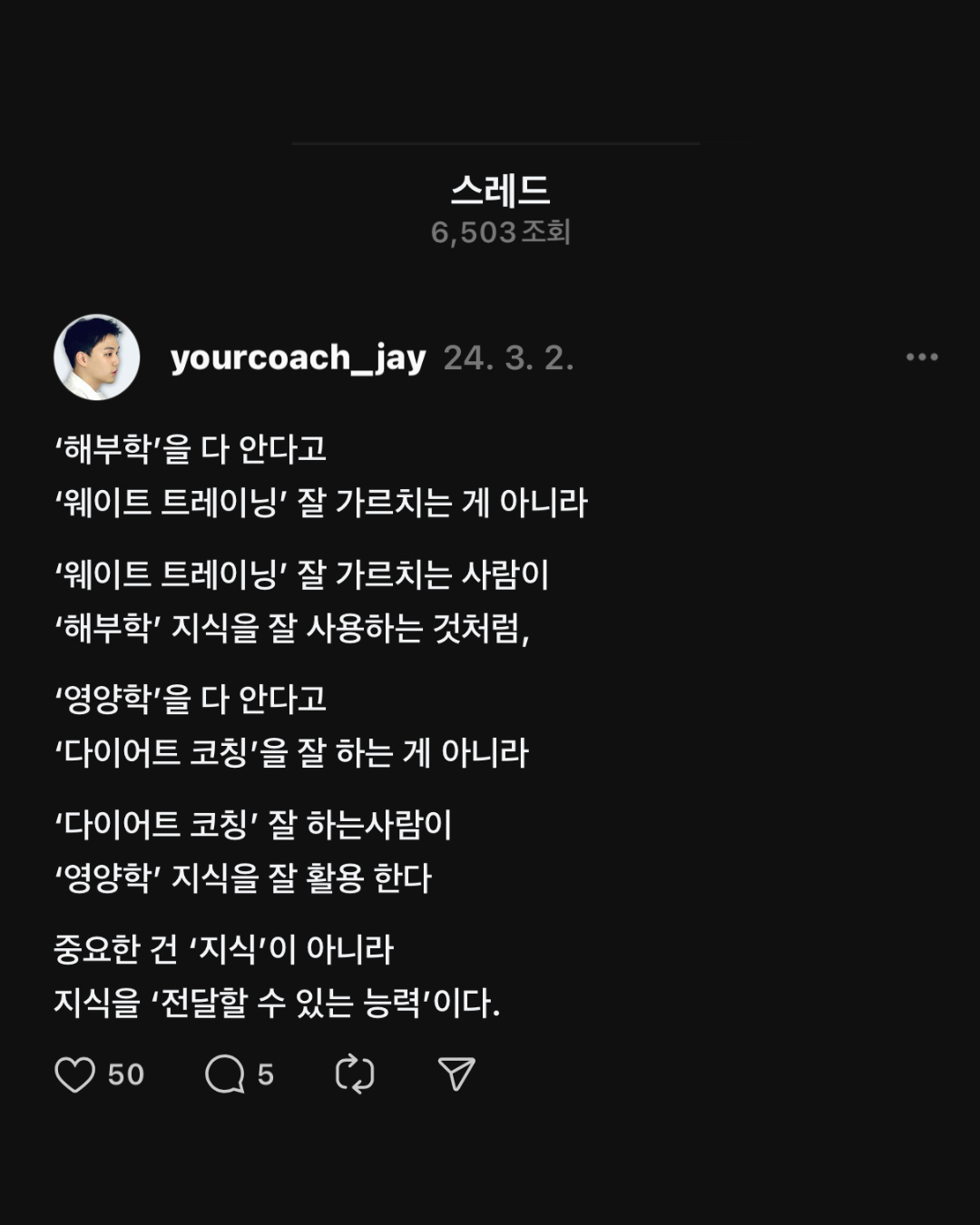 이론을 이론 자체로 배우지 마세요. 실전에 어떻게 적용시켜야 할지 연구해 보세요. ‘이건 배워도 실전에 적용하지 못할 것 같아’라는 말은 아직 가르치는 능력이 부족하다는 걸 스스로 인정하는 것입니다. 배운 이론을 실전에 잘 적용하는 방법은 회원이 겪고 있는 문제에 어떤 해답이 필요할지 고민하는 것입니다. 회원이 가지고 있는 문제를 해결하기 위해서 이론을 배우고 자료를 찾아보는 것이 트레이너로서 여러분이 해야 할 일입니다.