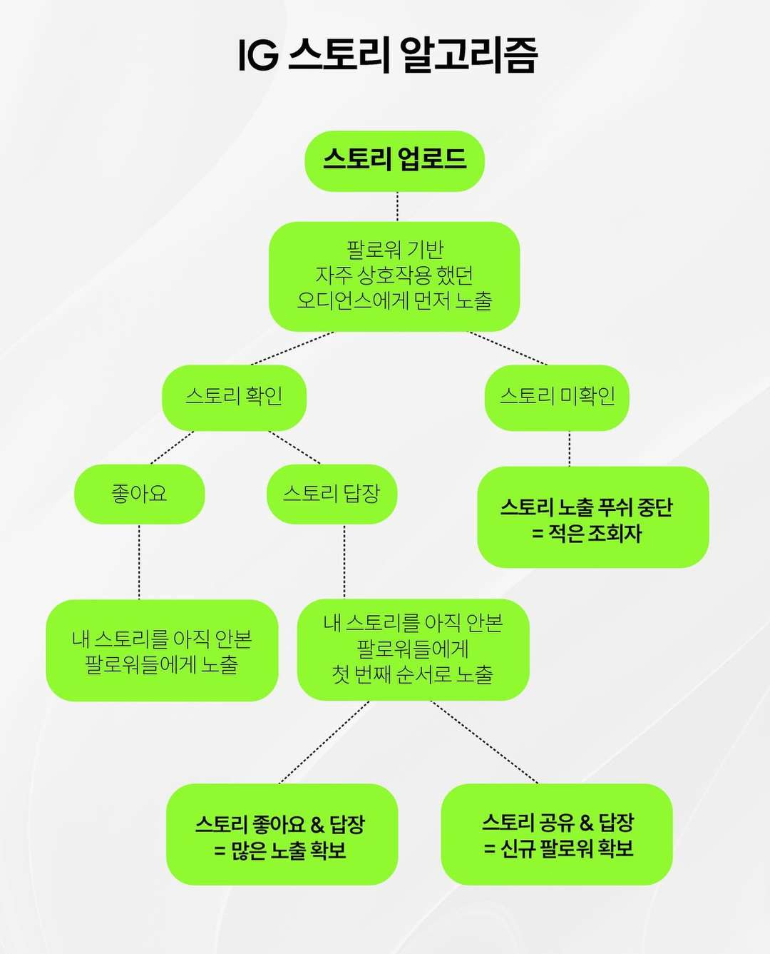 스토리는 보통 내 계정 스토리를 보고, 상호작용을 했던 유저 기반으로 우선 노출된다고 합니다. (스토리에 좋아요를 날리거나, 스토리 답장을 하거나(무물), 스토리에 설문조사를 하거나 (이게 좋아? 저게 좋아?)에 참여를 했던 사람들에게 노출)