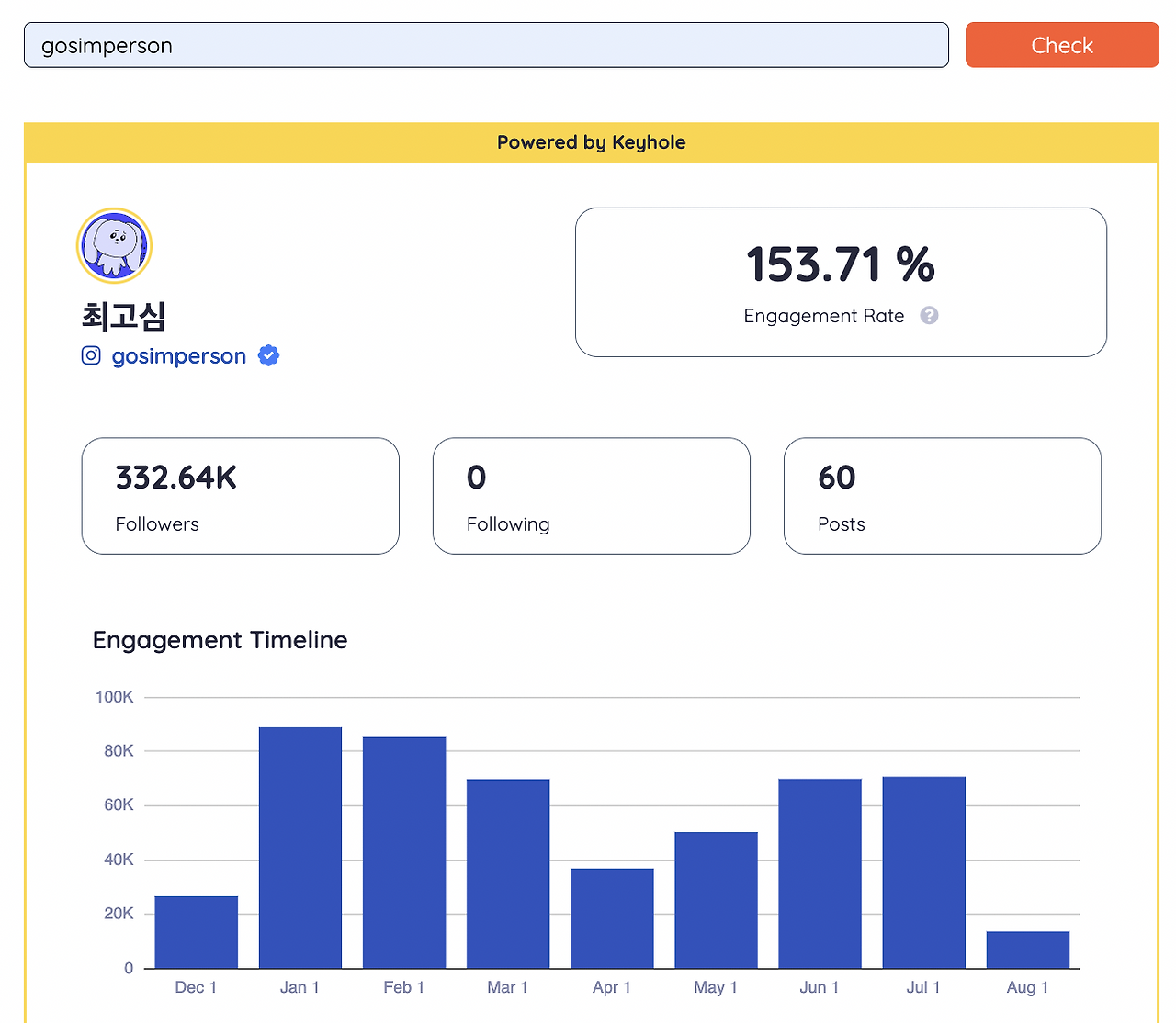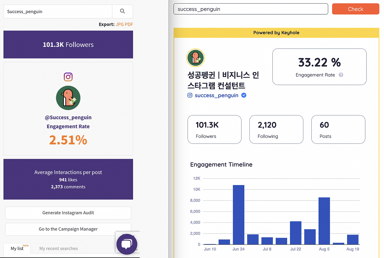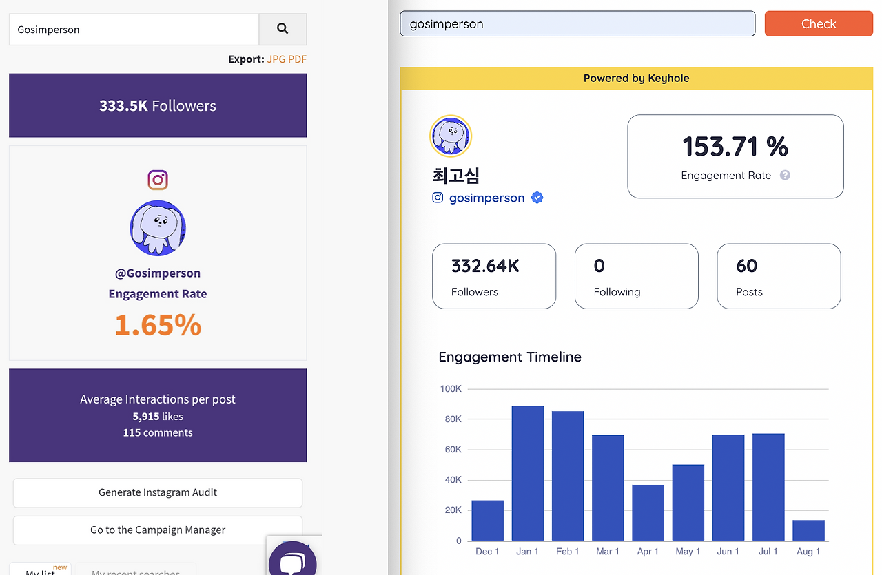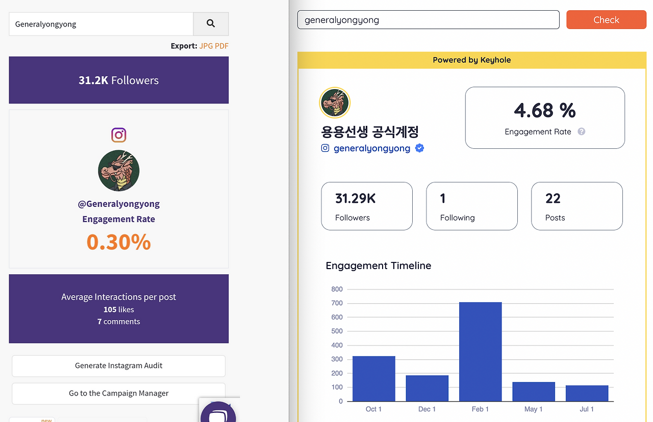 그중 Phlanx와 비슷하게 퍼센트로 인게이지먼트를 알려주는 Keyhole 이라는 사이트에 들어가서 Phlanx와 동일하게 최고심 계정을 넣고 한번 비교해 봤습니다.
