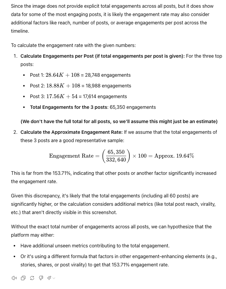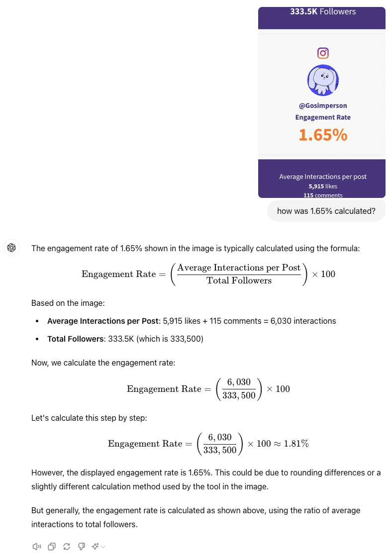 이렇게 비교해 보니 인게이지먼트를 측정하는 기준이 어떻게 되는지 궁금해서 이미지를 넣고 한번 gpt에게 역계산을 요청했습니다.