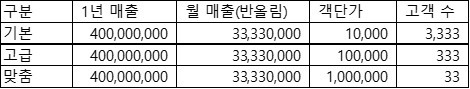 객단가가 1만원, 10만원, 100만원 제품이 있다고 가정하겠습니다. 목표 매출인 4억원을 달성하기 위해서는 제품별로 아래와 같은 고객 수가 필요합니다.