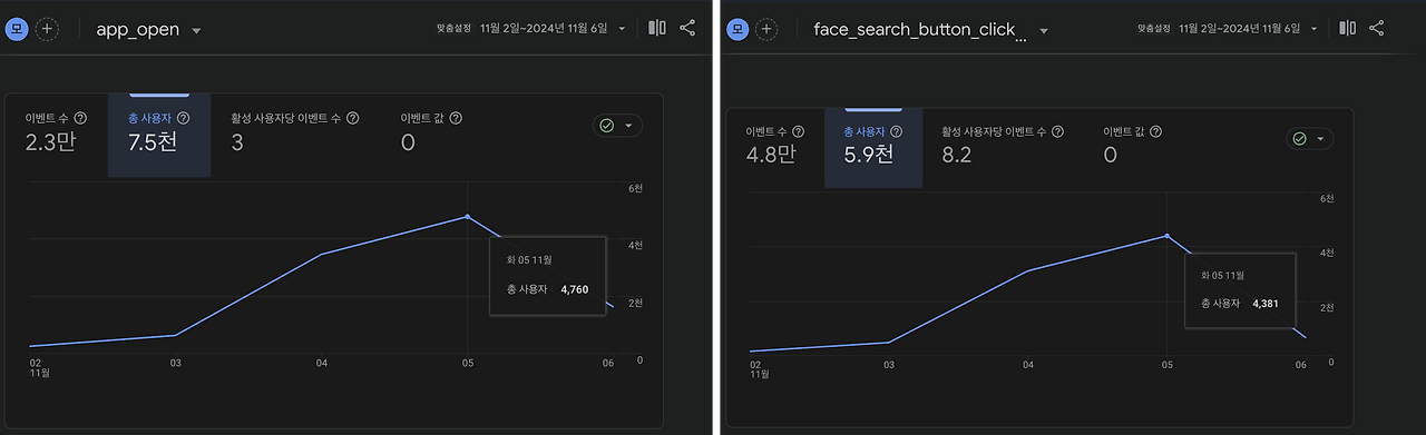 firebase 통계를 보니 대회 후 3일간 중복을 제외한 접속자가 8,831명. 그중 84.89%인 7,497명이 페이스서칭 기능을 사용했다. 접속한 10명 중 8-9명이 실제로 핵심 기능을 사용했다는 의미다.