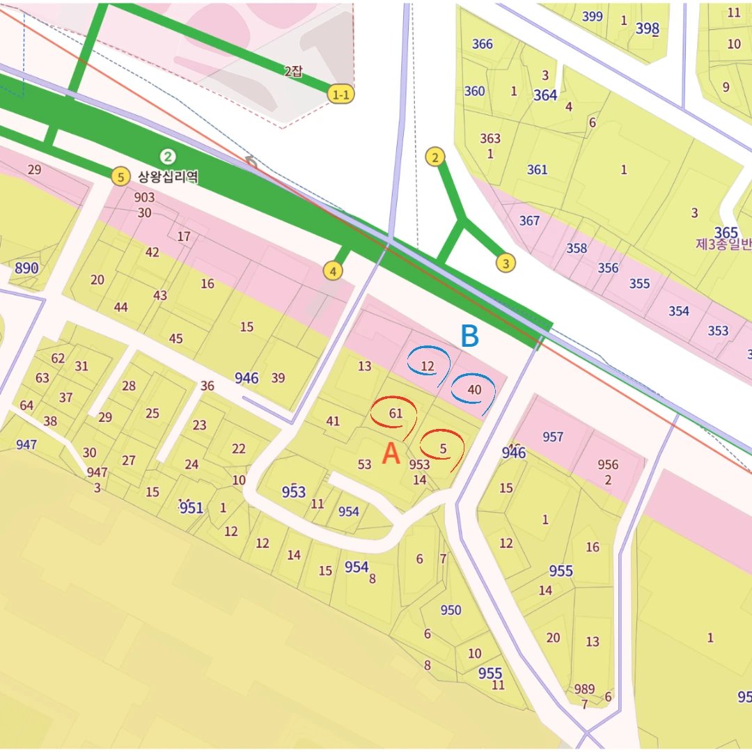 왜냐하면, 지적도를 펼쳐놓고보면 보다시피 서울에는 상업지구가 길게 이어진곳이 많지 않은데, 을지로에서 신당 왕십리까지 노선상업지 포함해서 분홍색으로 길게 왕십리까지 이어진것을 볼수있다.