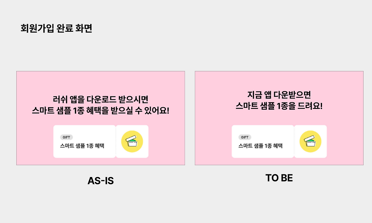 마지막으로 회원가입 완료 화면이다. 웹에서 회원가입을 한 경우, 앱 설치 유도를 위해 뜨는 메시지인데, 언뜻 봐도 문구가 너무 길다는 생각이 들었다. 유저가 취해야 하는 액션 > 그로 인해 받을 수 있는 혜택이 한눈에 보이도록 문구를 간결하게 수정했다.