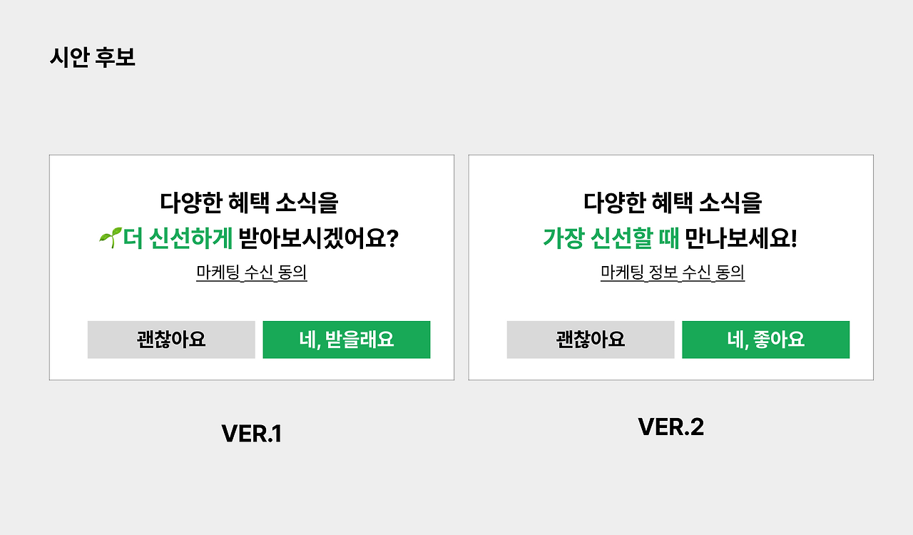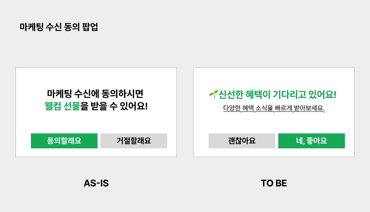 기존 문구를 살펴보자. '마케팅 수신에 동의하시면'이라는 전제가 명확하게 드러나 있다. 그러나 유저 입장에서 '마케팅 수신'이라는 문구를 보는 순간, 기겁하면서 거절할 수밖에 없다. 일종의 학습된 공포인 셈이다. 게다가 기본 버튼 (primary button) 역시 오른쪽이 아닌 왼쪽에 배치되어 있는 점도 어색하다.