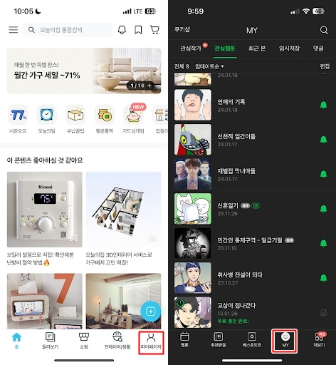 위 사진은 오늘의 집과 네이버 웹툰의 앱 화면이다. 제일 먼저 눈에 띄는 공통점은 바로, 마이페이지 아이콘 하단에 아주 친절하게 마이페이지 또는 MY라는 UI 텍스트를 삽입해 이 아이콘이 마이페이지로 향하는 아이콘임을 명확하게 보여주고 있다는 점이다.