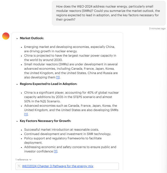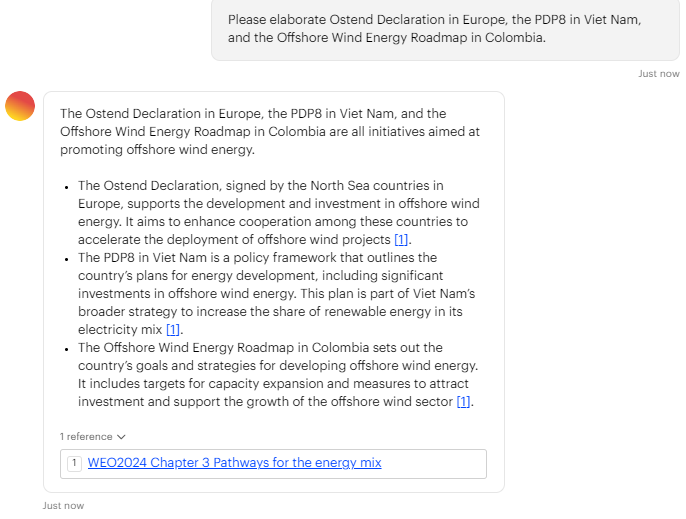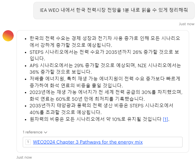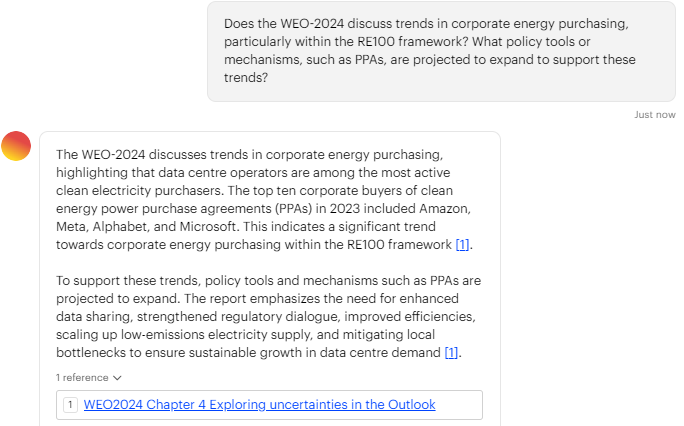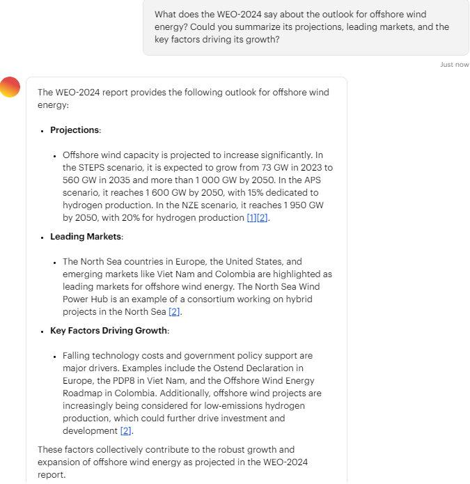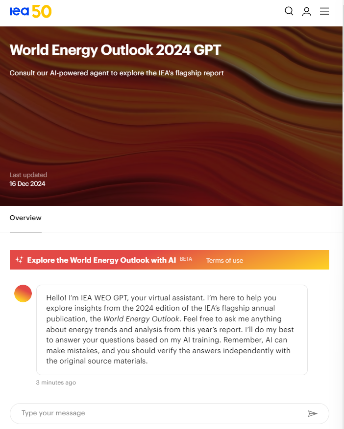 IEA WEO 2024 GPT 툴은 Microsoft와 협력해 개발된 첫 시도로, 간단한 대화 형식으로 에너지 데이터를 탐색할 수 있어요. 예를 들어, "향후 전력 수요는?"과 같은 질문을 던지면 WEO-2024 보고서 데이터를 기반으로 분석된 답변을 바로 제공합니다.