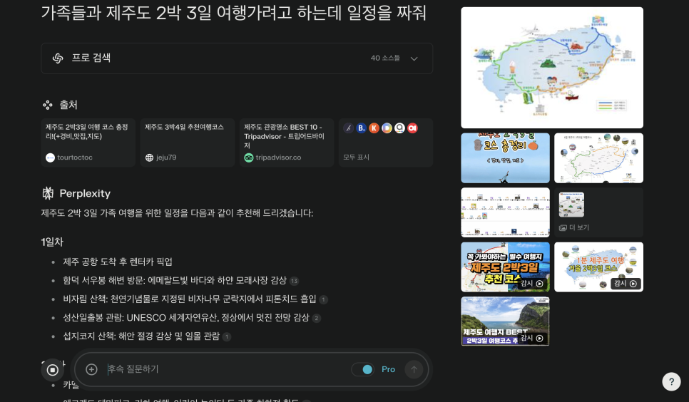 예를 들어 "서울에서 제주도 여행 계획 세우는 방법 알려줘"라고 물어보면, 교통편부터 숙소, 관광지, 맛집까지 한 번에 정리해서 알려주는데요.