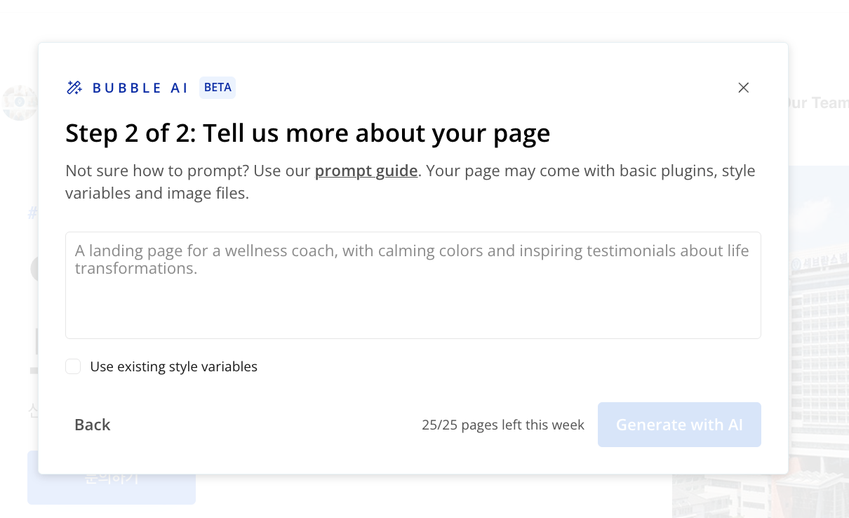 재밌는 부분은 노코드 툴에서 AI 기능이 함께 있다는 점입니다. 현재 버블은 AI 페이지 디자이너라는 기능을 제공 중입니다. AI 페이지 디자이너는 버블 AI가 입력한 프롬프트를 기반으로 페이지 UI를 만들어 주는 기능으로, 현재 모든 유저가 사용할 수 있습니다. 현재 베타 버전으로 모든 분이 사용하실 수 있습니다.