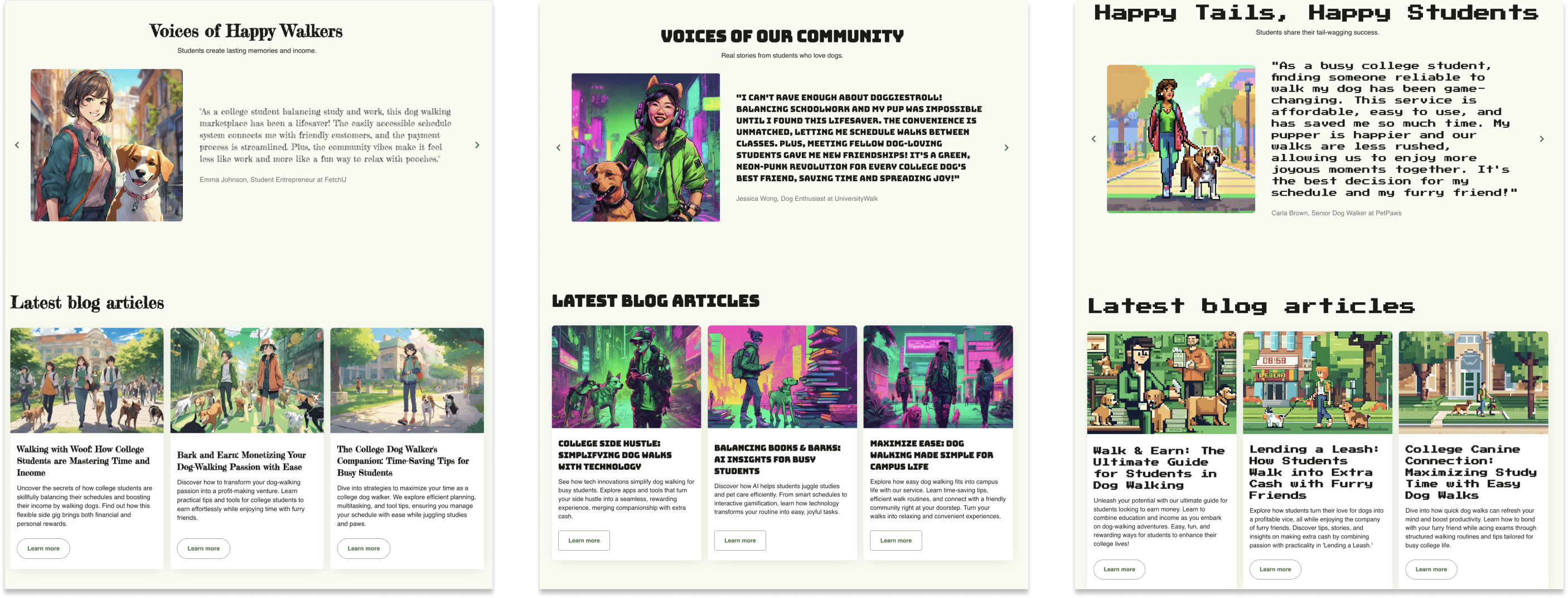 프롬프트를 어떻게 입력하느냐에 따라 생성된 페이지의 스타일도 완전히 달라집니다. 아래는 내용이 동일하고, 이미지 스타일만 다르게 프롬프트를 입력해 생성한 페이지입니다. 프롬프트에서 "애니", "네온펑크", "픽셀" 스타일의 이미지를 사용하라고 말했습니다. 그 결과 페이지의 전체 컬러는 동일하지만, 폰트와 이미지에서 큰 차이를 보입니다.