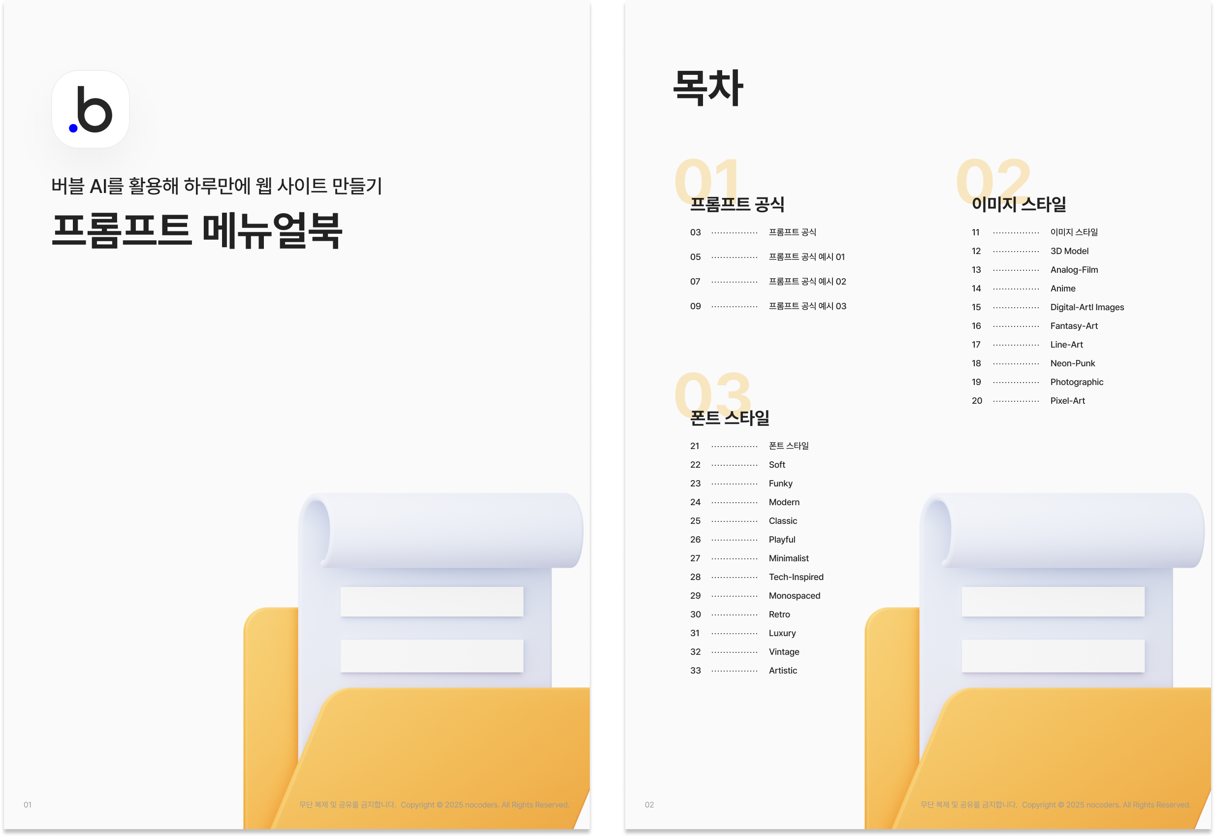AI를 잘 활용하기 위해선 무엇보다 프롬프트가 중요합니다. 어떤 프롬프트를 입력하는지에 따라서 AI가 만드는 결과물을 천차만별이며, 자신이 원하는 페이지를 생성하기 위해선 그에 딱 맞는 프롬프트가 필요합니다. 다양한 프롬프트를 조합해 테스트를 진행했고, 실험 결과를 종합해 작성한 프롬프트 가이드북도 강의에서 함께 제공됩니다.