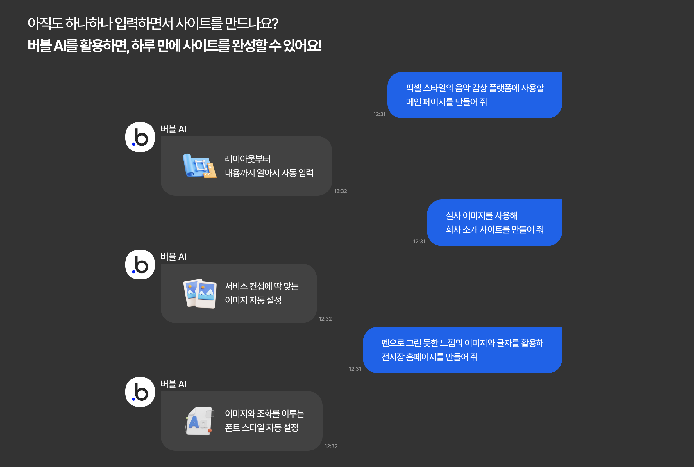 많은 분이 사이드 프로젝트나 스텔스 창업을 위해 버블로 사이트 및 서비스를 만들고 있습니다. 하지만, 혼자만의 힘으로 만들기엔 할 일이 너무도 많습니다. 서비스 기획부터 UI 디자인, 버블 개발까지 너무 많은 일을 혼자서 해내야 합니다. 이런 분들이 AI 페이지 디자이너 기능을 잘 활용한다면 큰 도움이 될 수 있을 거 같아서, "AI 페이지 디자이너 기능을 활용해 웹사이트를 하루 만에 런칭하기"를 주제로 강의를 준비했습니다.